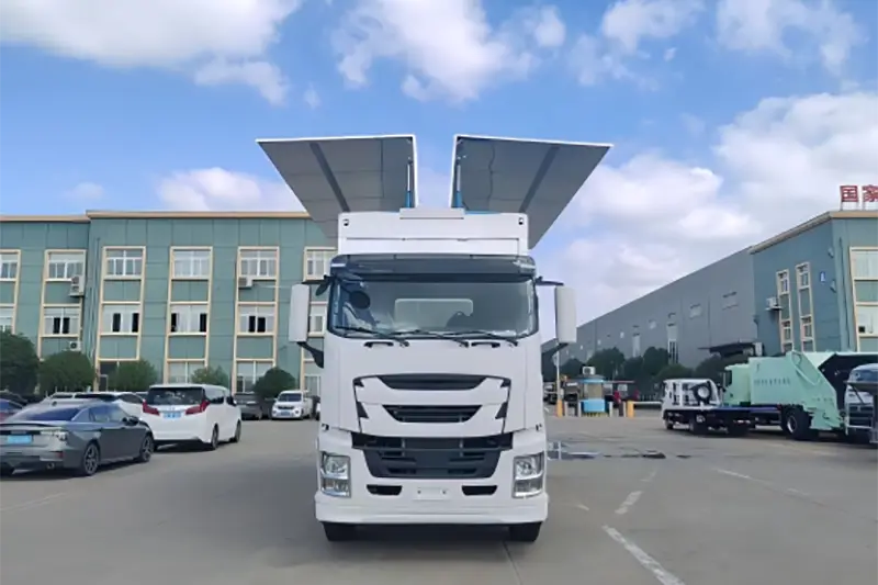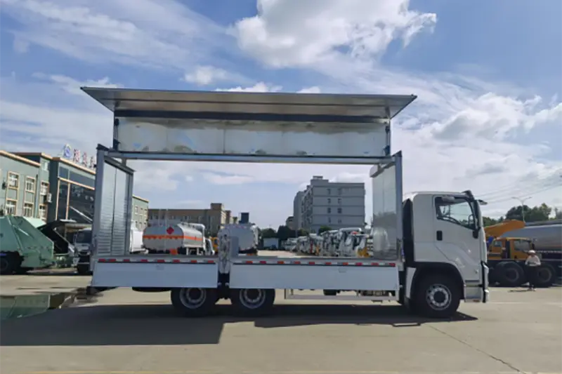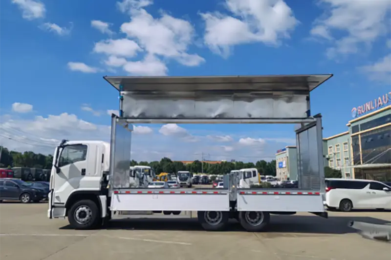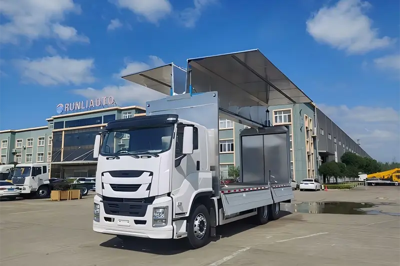 Runli Aluminium Alloy Wingspan Truck หรือที่รู้จักกันอย่างแพร่หลายในชื่อรถตู้เปิดปีกหรือรถบรรทุกกล่องแบบกางออกด้านข้าง เป็นรถบรรทุกพิเศษสมรรถนะสูงที่ดัดแปลงจากแชสซี Isuzu 6X4 ของแท้ ซึ่งได้รับการอัพเกรดเพื่อแก้ปัญหาปัญหาประสิทธิภาพในการขนถ่ายต่ำสำหรับสินค้าขนาดใหญ่ หนัก และขนาดใหญ่ แตกต่างจากรถบรรทุกเปิดปิดแบบเปิดหลังแบบดั้งเดิม แผงด้านข้างของตู้บรรทุกสินค้าและหลังคาครึ่งหนึ่งจะกางออกด้วยระบบไฮดรอลิกเหมือนปีก ทำให้เกิดพื้นที่บรรทุกสินค้าสามมิติที่กว้างขวางที่รองรับการบังคับควบคุมหลายทิศทางจากด้านข้าง ด้านหน้า และด้านหลัง เป็นเครื่องมือการขนส่งโลจิสติกส์หลักที่ใช้กันอย่างแพร่หลายในการกระจายสินค้าเทกองทั่วโลก การส่งมอบอุปกรณ์อุตสาหกรรม และการขนส่งสินค้าทางการเกษตร ซึ่งสร้างสมดุลระหว่างการป้องกันสินค้าและประสิทธิภาพการจัดการสำหรับผู้ซื้อขายส่งระหว่างประเทศและองค์กรโลจิสติกส์โดยเฉพาะ